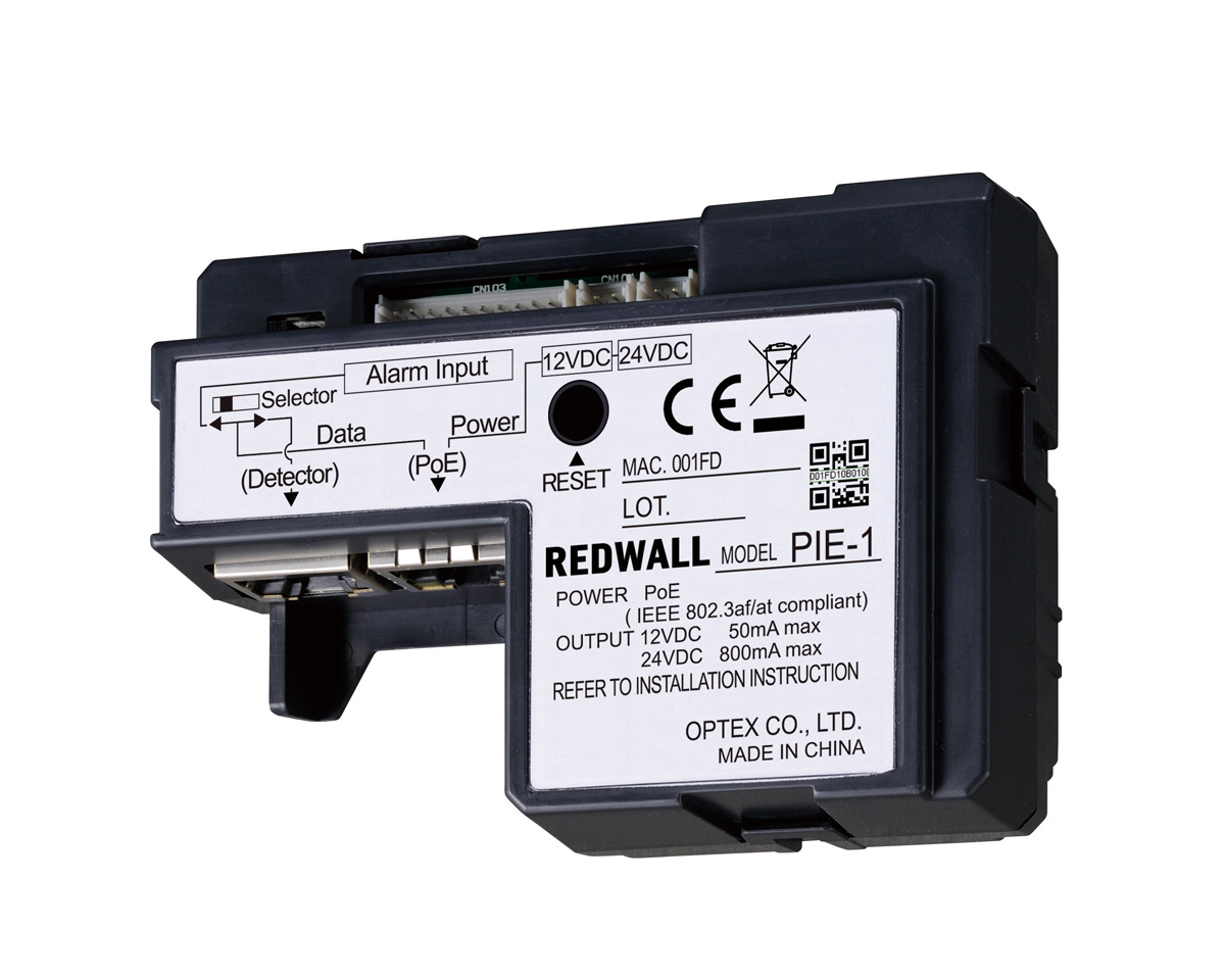 PIE-1 is an encoder that converts analog relay outputs to the original ASCII code (Redwall Event Code) for Redwall and Fiber SenSys detectors. Detectors can be connected to Video Management Software platforms with PIE-1 and control IP cameras. PIE-1 is generating Redwall Event Code using the analog alarm inputs from the Redwall and Fiber SenSys detectors. Video Management Software receives the event code and sends a command to reposition to a pre-set and/or start recording with a camera. PIE-1 is compatible with Power over Ethernet (PoE). IEEE802.3 af/at making it possible to supply power using a PoE hub or switch. Only one LAN cable is needed to connect PIE-1 to a PoE hub or switch reducing your installation time and cost.